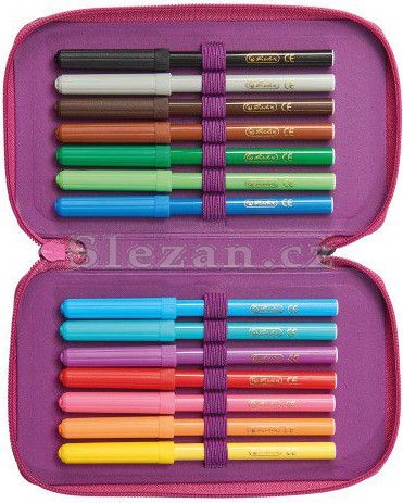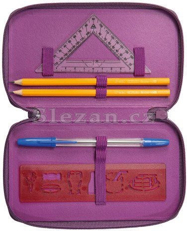 31 dílů - 14 fixů, 8 pastelek, 2 tužky, ořezávátko, guma, 16 cm pravítko, trojúhelník, úhloměr, pravítko - šablona, kuličkové pero,