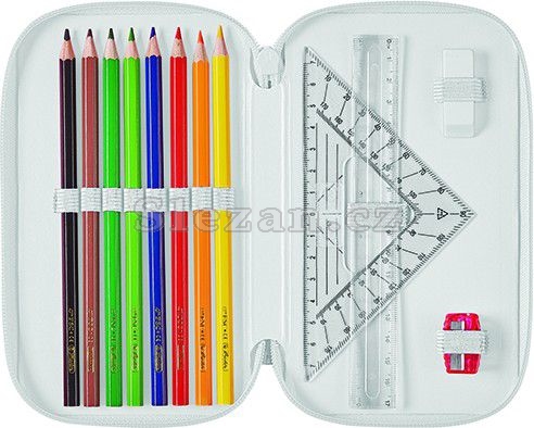 31 ks, materiál polyester, 3 přihrádky na zip (barevné), vnitřní materiál: barevný, výplň: 14 fix, 8 šestihranných pastelek, 1 trojúhelníkové pravítko, 1 úhloměr , 1 kuličkové pero, 1 barevná šablona, 1 design: Cute Animals Želva