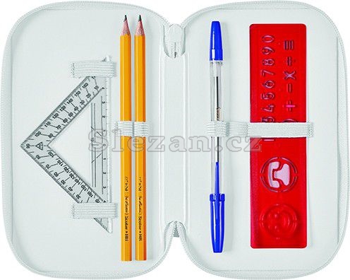 vnitřní materiál: barevný, výplň: 14 fix,8 šestihranných pastelek, 2 černé šestihranné tužky, 1 plastové ořezávátko, 1 guma, 1 plastové pravítko 17 cm, motiv kůň
