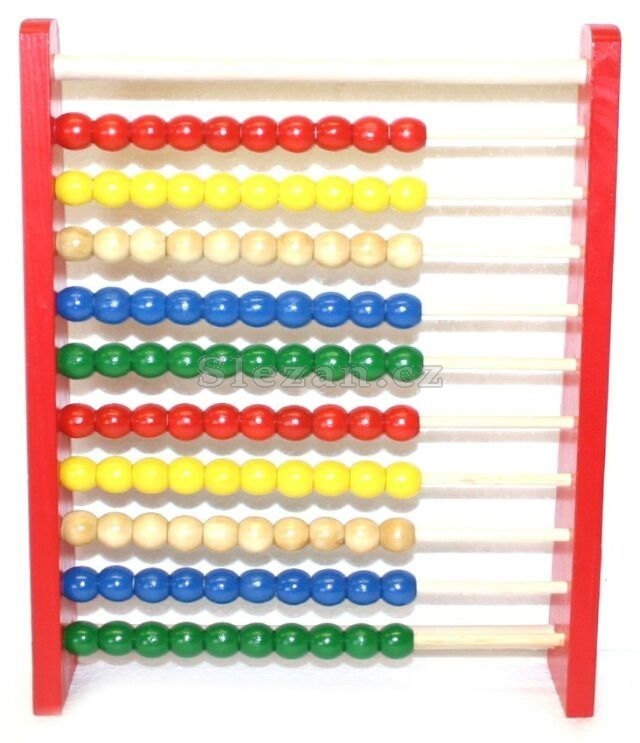 Klasické dřevěné počítadlo s deseti řadami o deseti barevných kuličkách.
