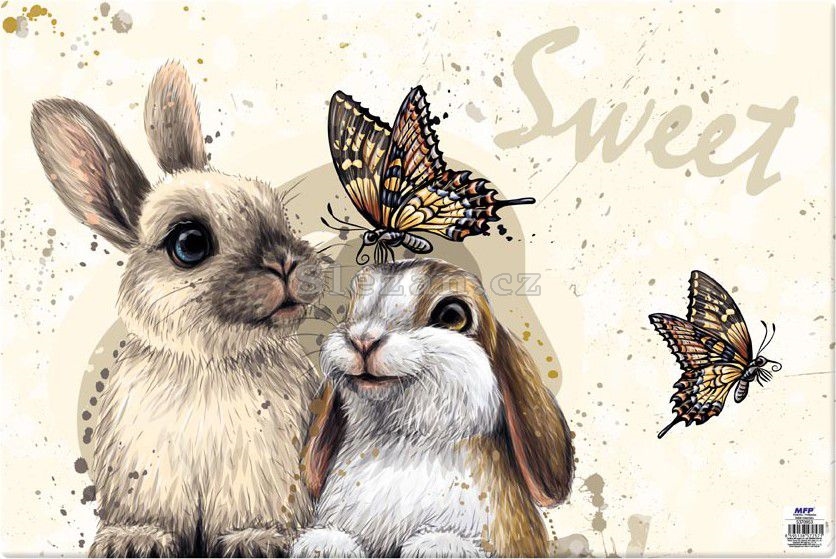 Psací podložka na stůl s obrázkem králíčci. Slouží jako podklad pod kreslení, modelování a jiné tvůrčí činnosti. Chrání nábytek proti poškození a je praktickým pomocníkem školáka. Podložka je vyrobena z papíru, který je zatavený v pevném plastovém obalu. Podložka je velice dobře omývatelná, stačí setřít vlhkým hadříkem. Odolná proti pokreslení pastelkami. Uvedená cena je za 1 ks.
