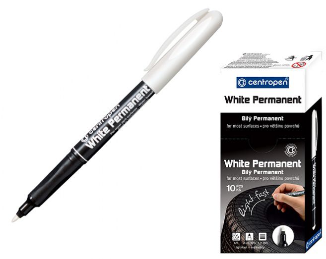 Univerzální bílý značkovač s permanentnmím, světlostálým inkoustem. Bílý inkoust na vodní bázi píše na povrch většiny materiálů. Po zaschnutí odolává vodě, otěru, povětrnostním vlivům. Doporučuje se skladovat ve vodorovné poloze. Válcový hrot 1,2 mm. Obzvláště vhodný pro značení pneumatik např. v pneuservisech.
