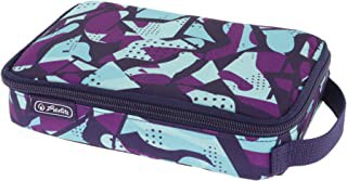 Pouzdro s jednou velkou kapsou na zip, 1 chlopeň s poutky a geometrická kapsa vč. geometrického trojúhelníku, 1 síťová kapsa, barva fialovo-modrá.