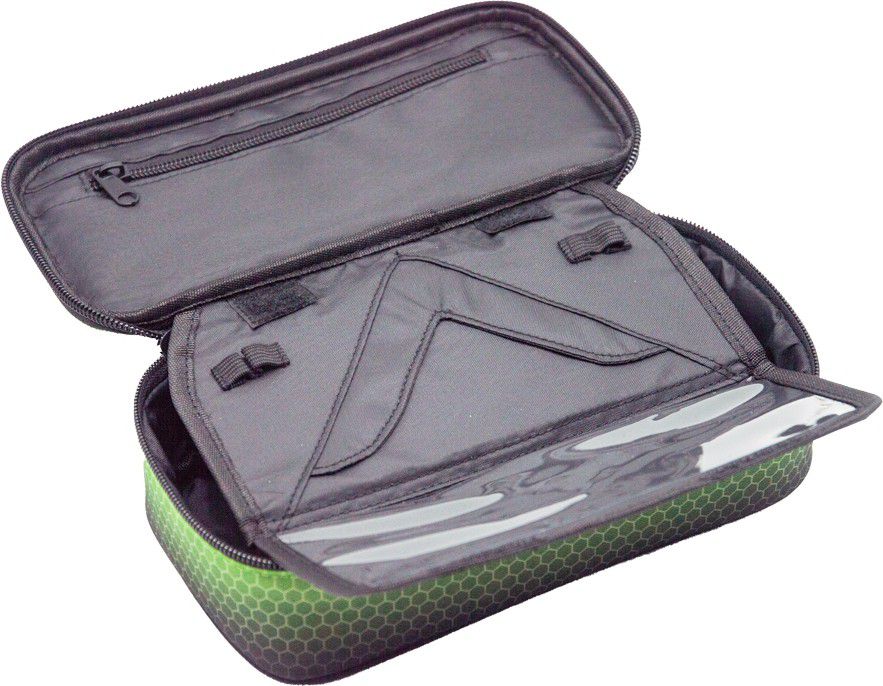 Školní pouzdro je opatřeno pevnými zipy, uzavíratelnou kapsičkou na zip, přihrádkou na pravítko a klopou s šesti poutky na psací potřeby.