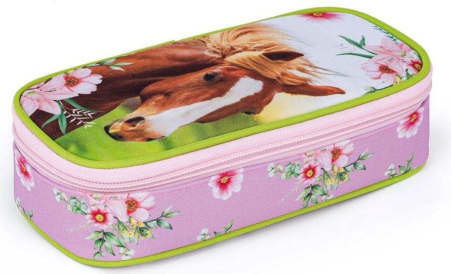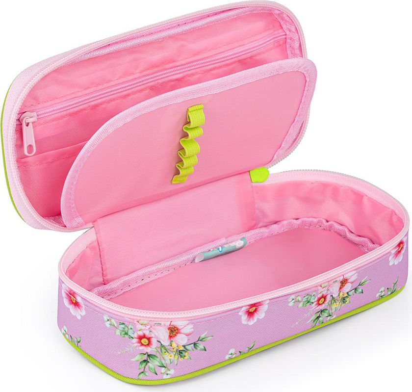 Školní pouzdro etue je opatřeno pevnými zipy, kapsičkou na zip a klopou s pevnými poutky po obou stranách.