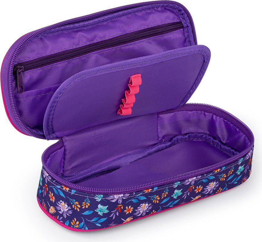 Školní pouzdro etue je opatřeno pevnými zipy, kapsičkou na zip a klopou s pevnými poutky po obou stranách.