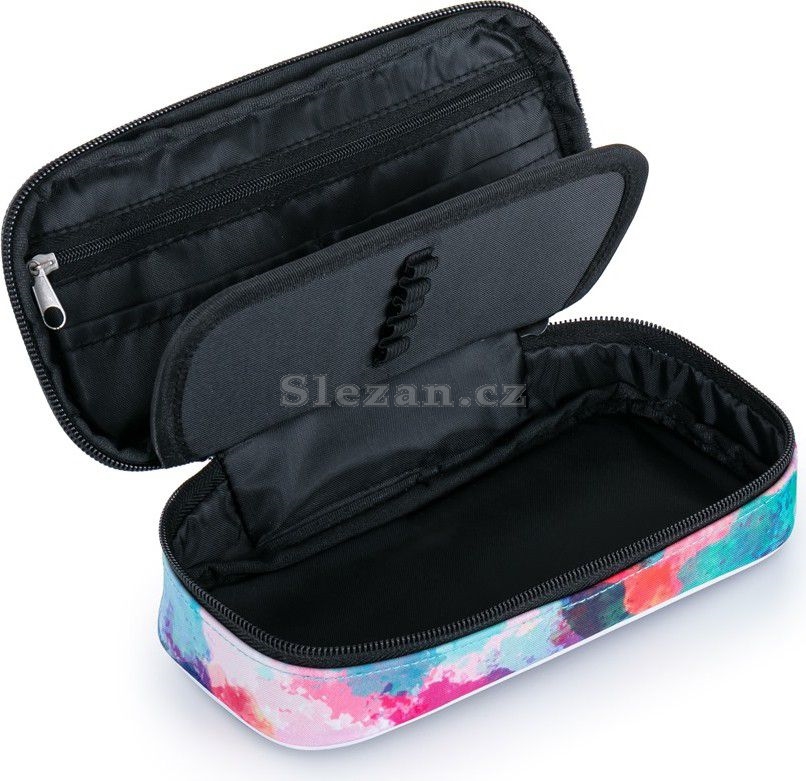 Školní pouzdro etue v barevném provedení. Pouzdro je opatřeno pevnými zipy, kapsičkou na zip a klopou s pevnými poutky po obou stranách. Pod klopou je místo pro volné uložení psacích potřeb nebo jiných drobností. Vhodné pro školáky na 2. stupni a starší studenty.