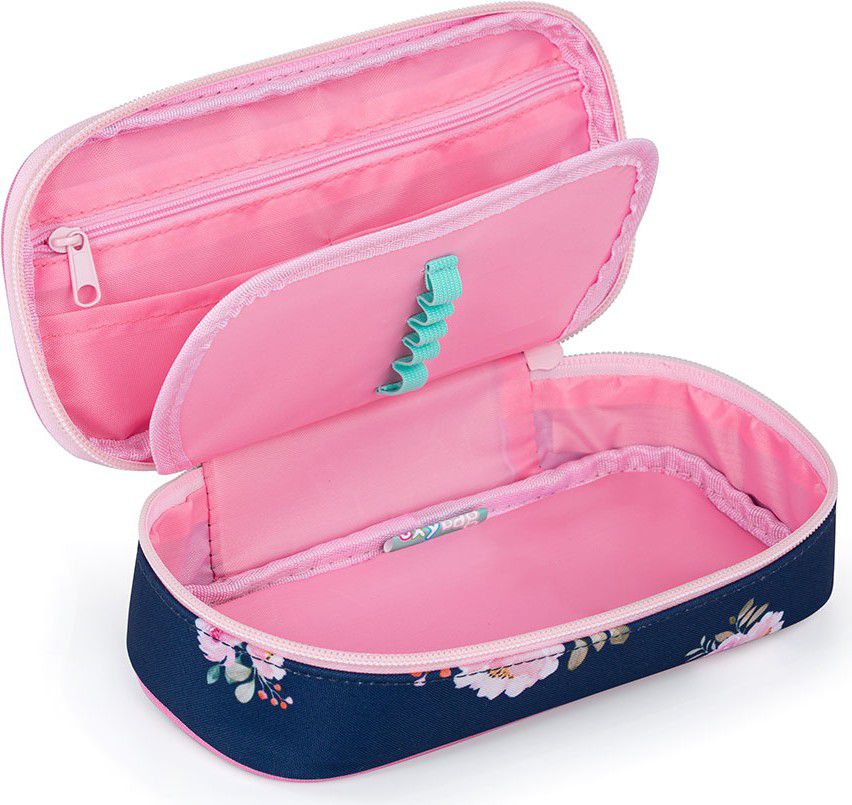 Školní pouzdro etue je opatřeno pevnými zipy, kapsičkou na zip a klopou s pevnými poutky po obou stranách.