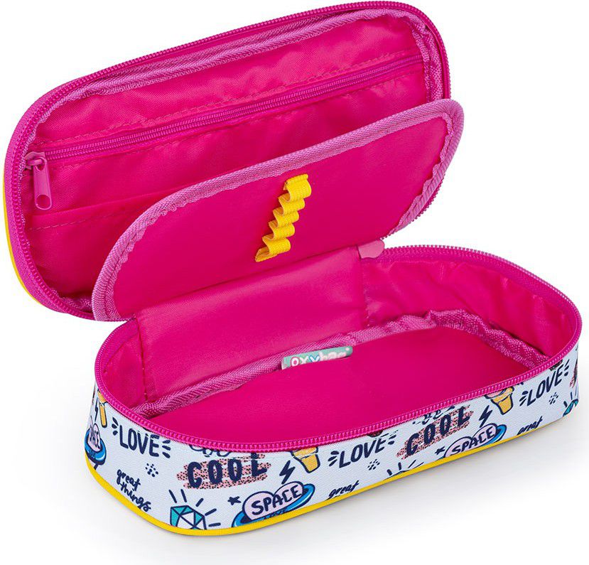 Školní pouzdro etue je opatřeno pevnými zipy, kapsičkou na zip a klopou s pevnými poutky po obou stranách.