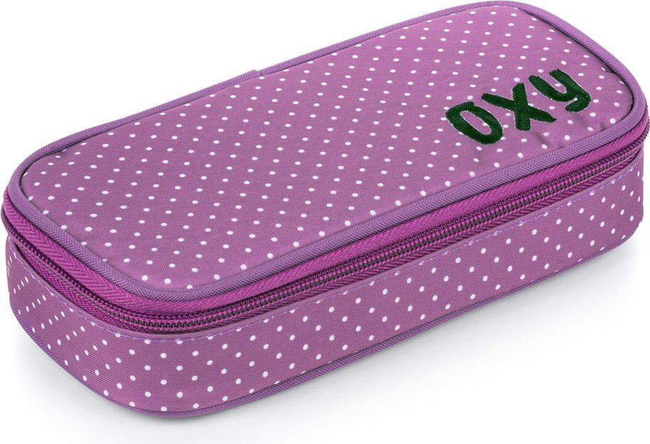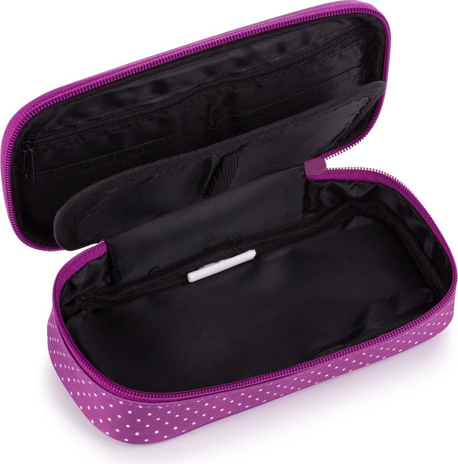 Školní pouzdro etue je opatřeno pevnými zipy, kapsičkou na zip a klopou s pevnými poutky po obou stranách.