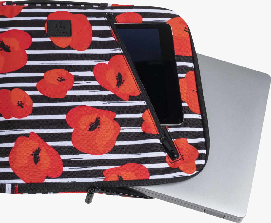Výrazný motiv červených květů vlčího máku, evokující letní rozkvetlou louku. Svým rozměrem pojme pouzdro notebook o velikosti 15 - 16 .