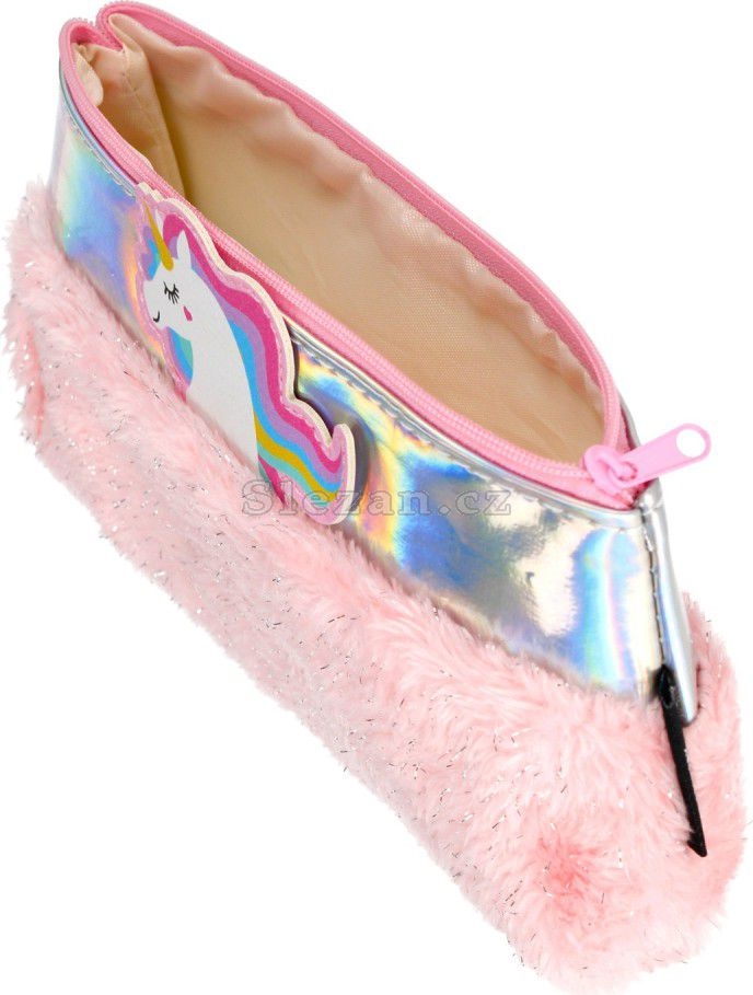 Sáček v růžové a holografické barvě z plyšového materiálu s grafikou Unicorn.