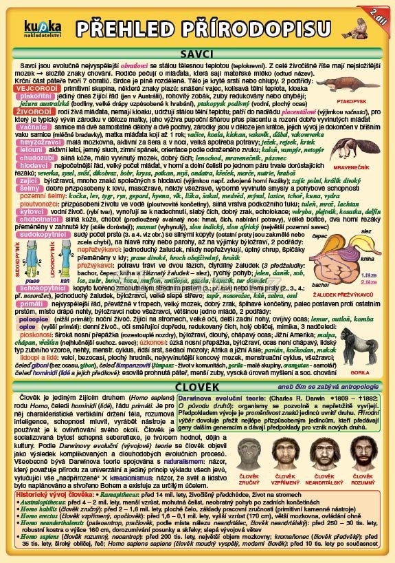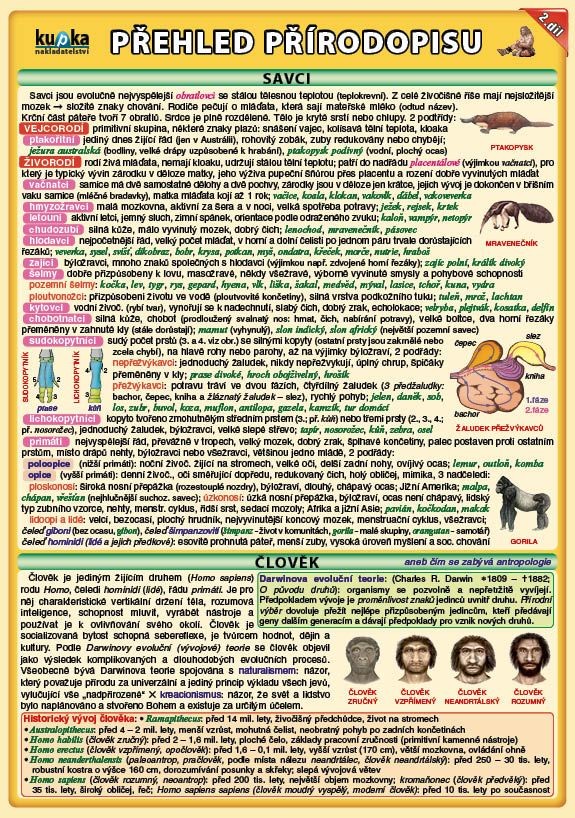 - kapitoly: Savci (Vejcorodí, Živorodí), Člověk, Stavba těla člověka (Soustava opěrná, pohybová, dýchací, trávicí, vylučovací, oběhová a imunitní, kožní, hormonální, smyslová, rozmnožovací, nervová), Genetika, Země (Stavba Země, Utváření zemského povrchu, Vývoj Země, Nerosty, Horniny)
