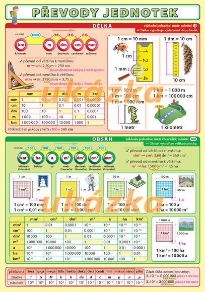 Přehledně zpracované převody jednotek délky, obsahu, objemu, hmotnosti a času.