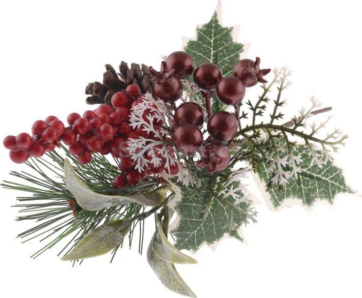 Umělá dekorační přízdoba v podobě větvičky, která se skládá z borovice, cesmíny, túje, šišky a červených bobulí.