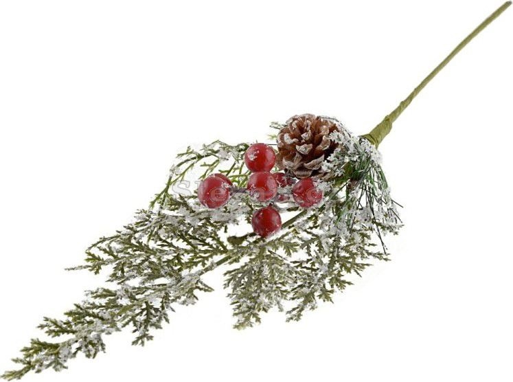 Umělá dekorační přízdoba ze zasněžené větvičky túje s šiškou a červenými bobulemi.