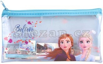 Krásná holčičí sada psacích potřeb s motivem Ledového Království Frozen  2. Tento praktický set pro všechny malé školáky obsahuje gumu,  ořezávátko, tužku a pravítko. Baleno v průhledné plastové taštičce se