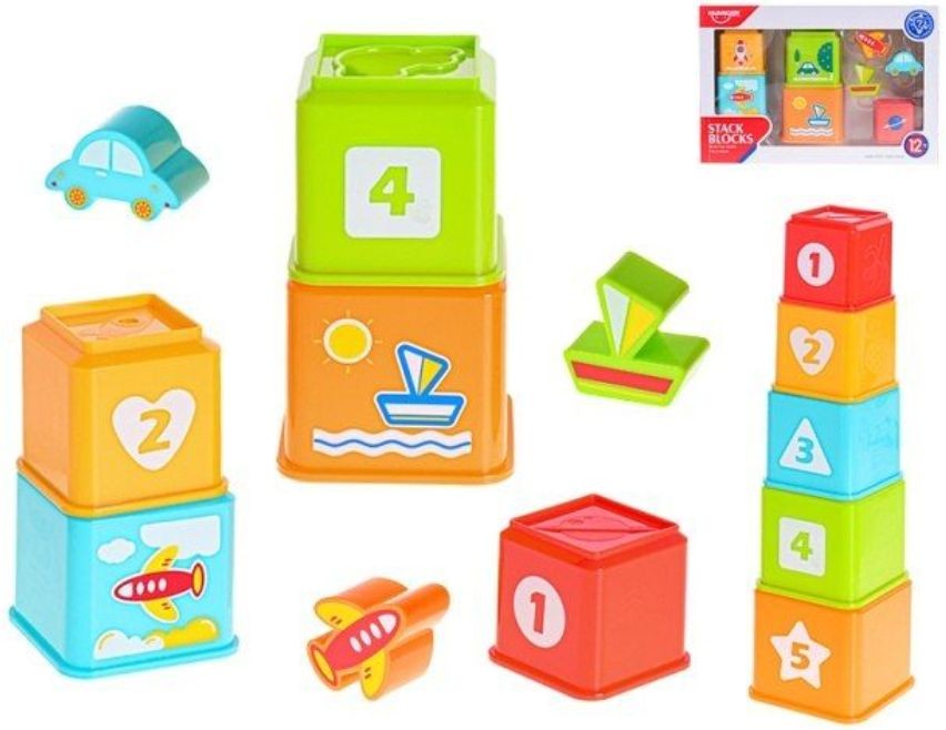 Balení obsahuje 5 skládacích kostek a 3 vkládačky.