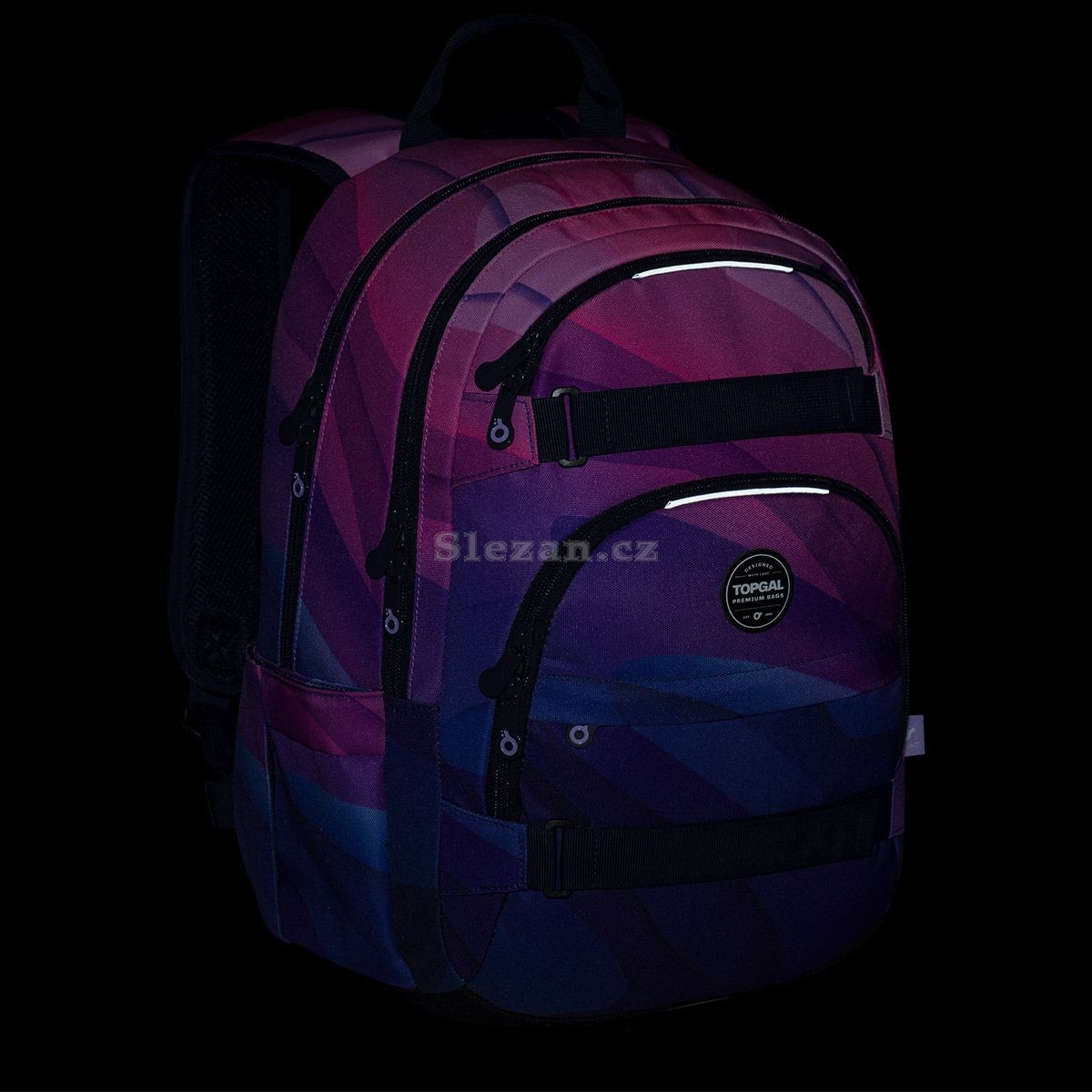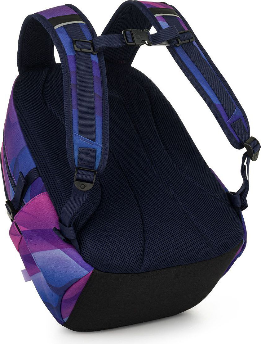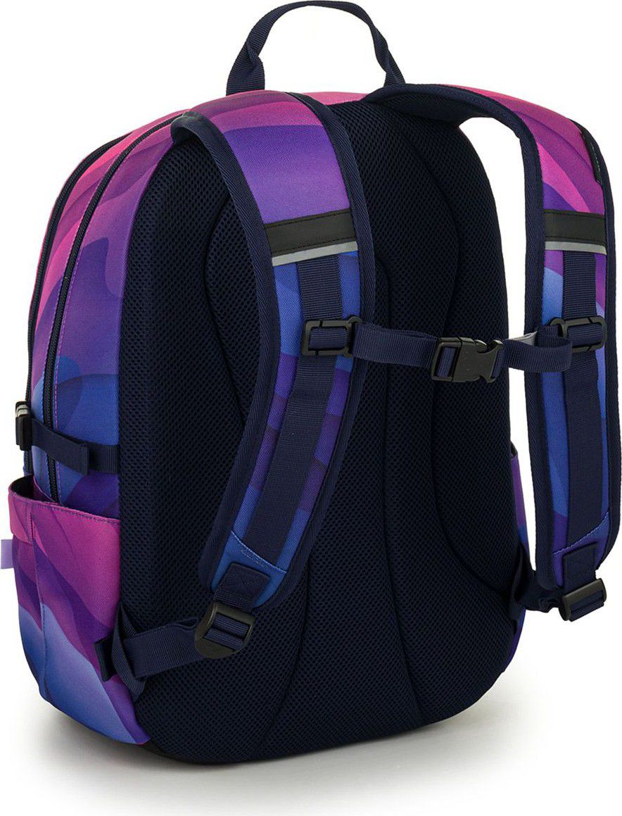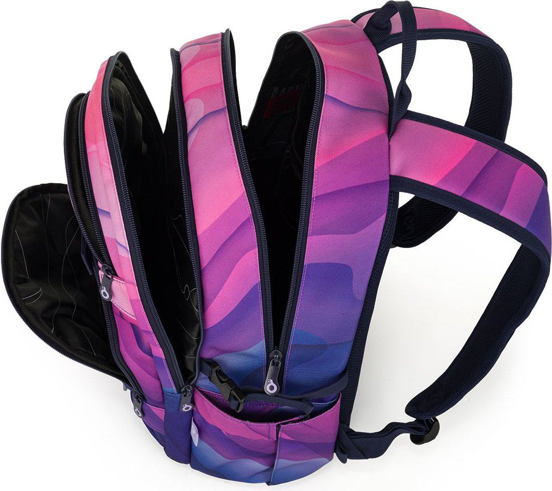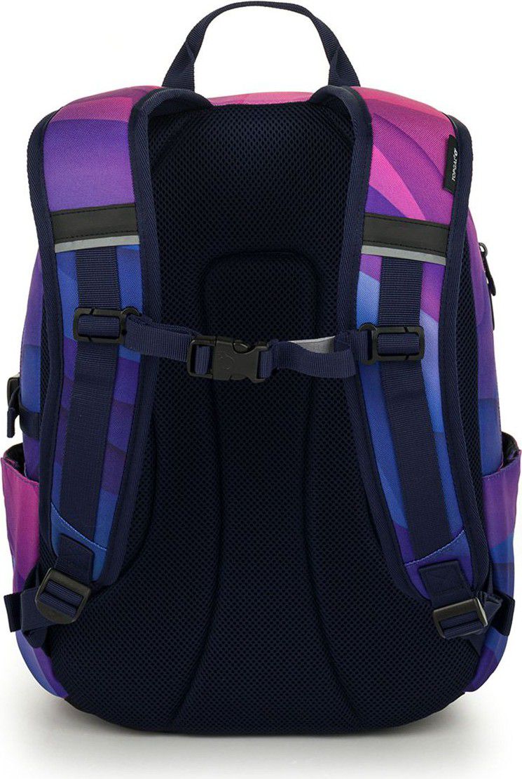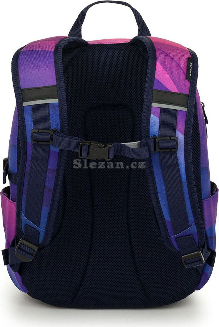 Dvoukomorový batoh se stylovou nášivkou v oblíbené růžovo fialové kombinaci. Záda batohu jsou polstrovaná a anatomicky tvarovaná z měkké pěny. Uvnitř zadní komory je umístěna polstrovaná kapsa na notebook a síťovaná kapsa na zip, v druhé komoře najdete klíčenku.