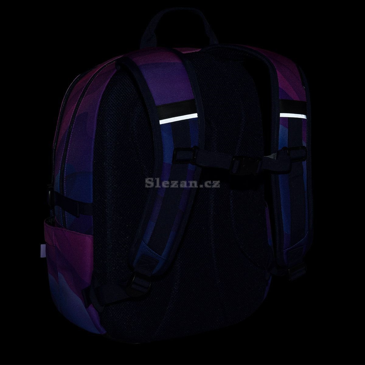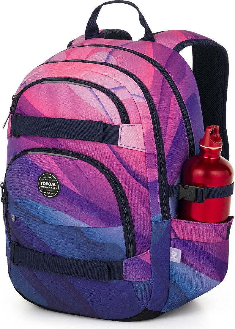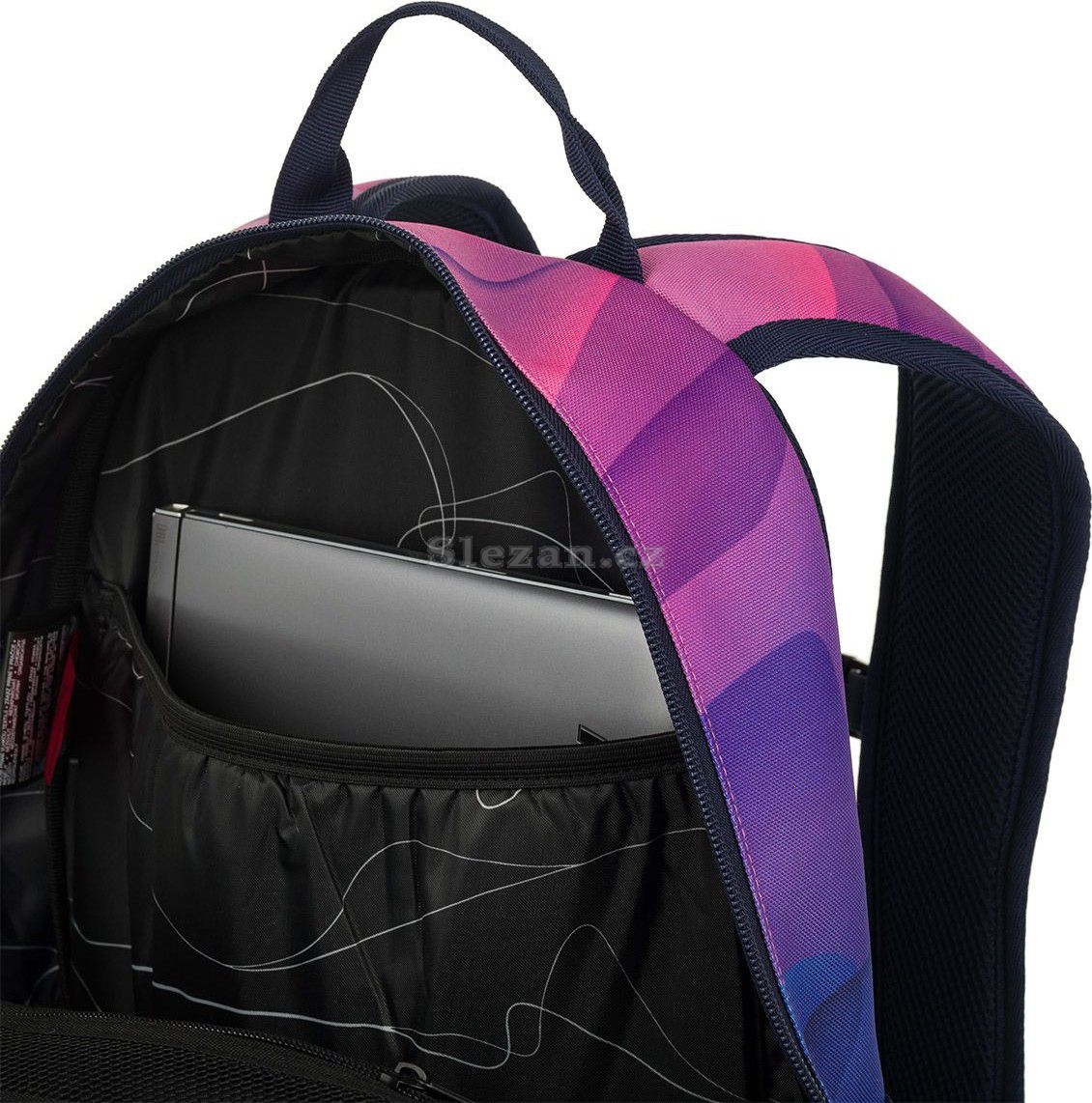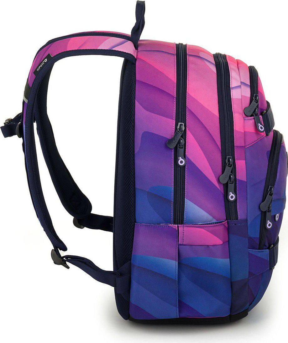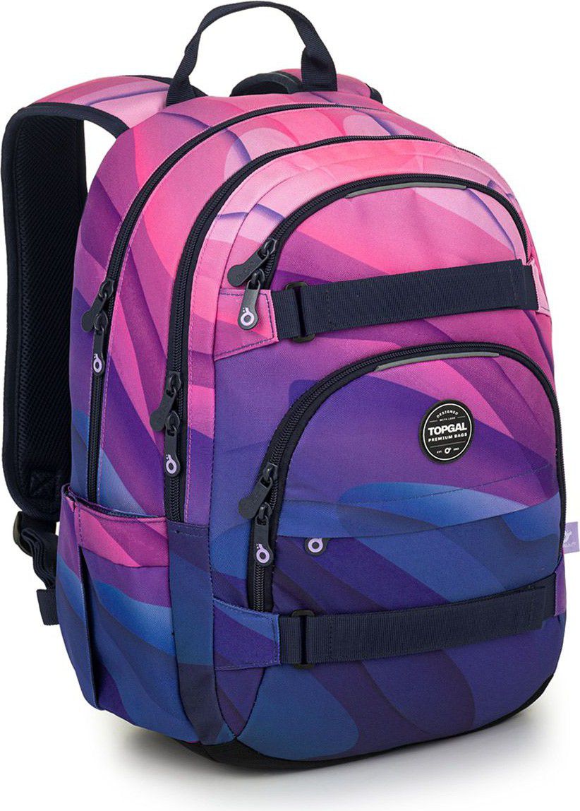 Dvoukomorový batoh se stylovou nášivkou v oblíbené růžovo fialové kombinaci. Záda batohu jsou polstrovaná a anatomicky tvarovaná z měkké pěny. Uvnitř zadní komory je umístěna polstrovaná kapsa na notebook a síťovaná kapsa na zip, v druhé komoře najdete klíčenku.