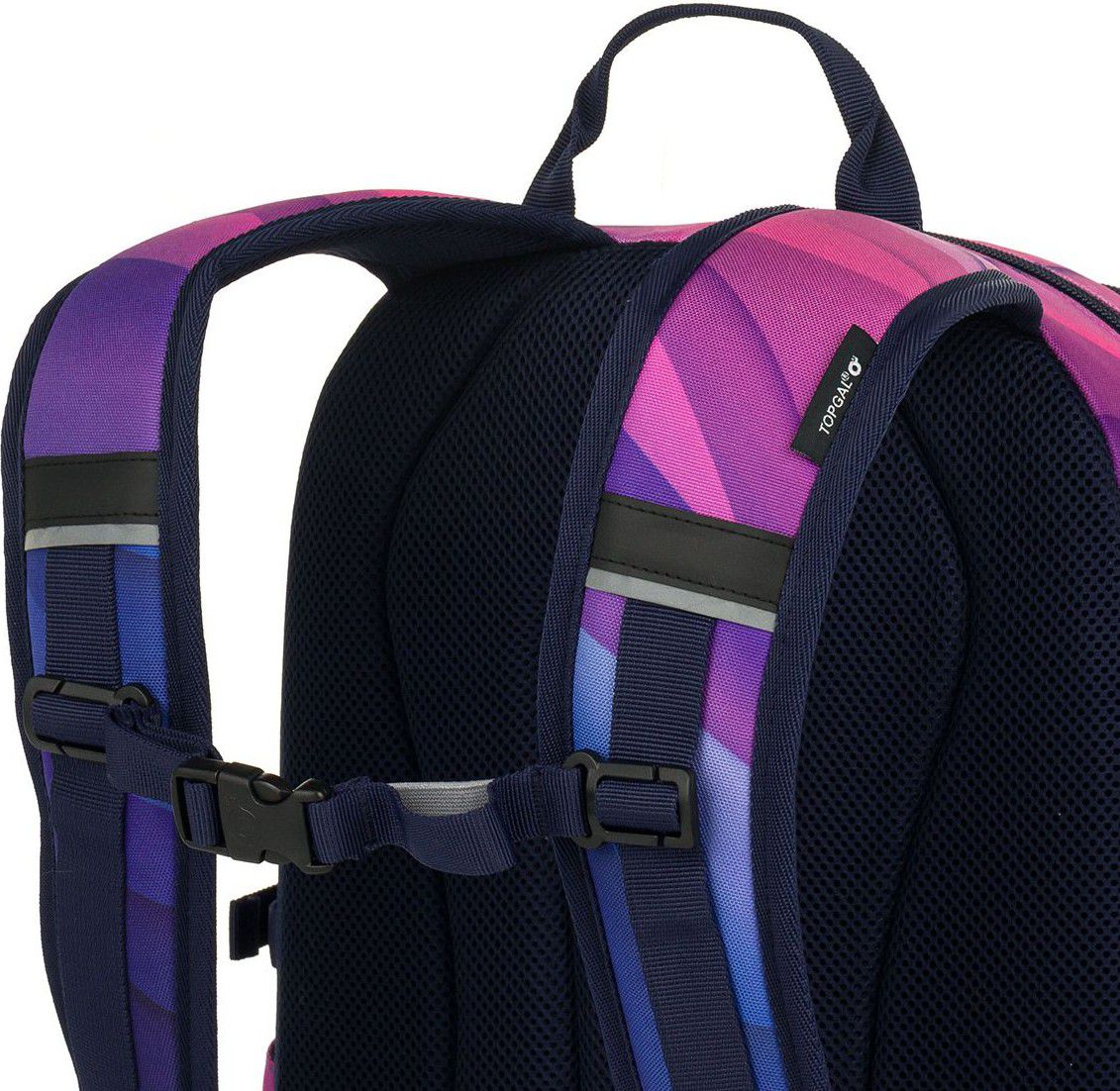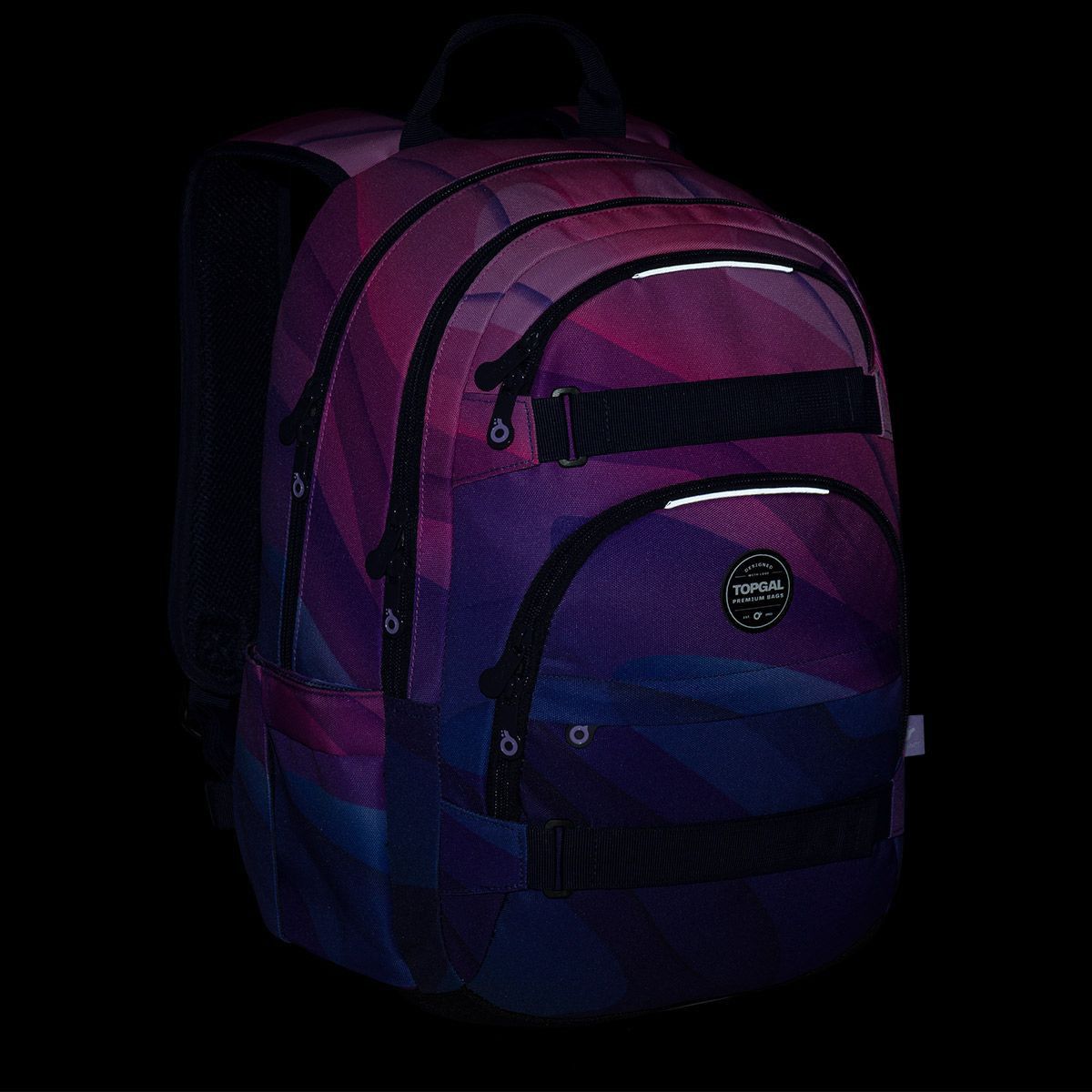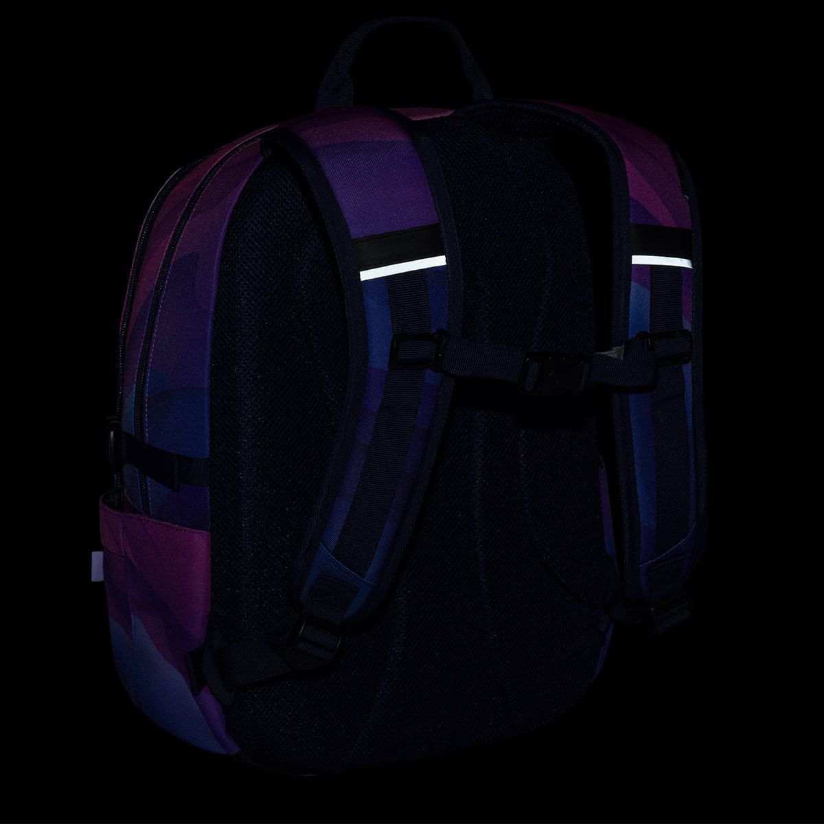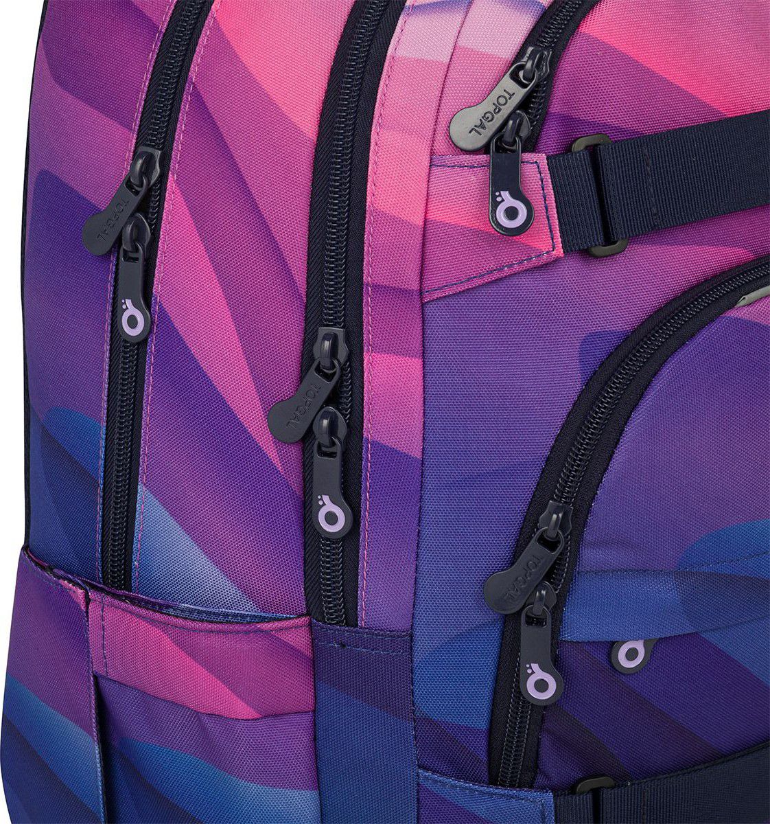 Dvoukomorový batoh se stylovou nášivkou v oblíbené růžovo fialové kombinaci. Záda batohu jsou polstrovaná a anatomicky tvarovaná z měkké pěny. Uvnitř zadní komory je umístěna polstrovaná kapsa na notebook a síťovaná kapsa na zip, v druhé komoře najdete klíčenku.