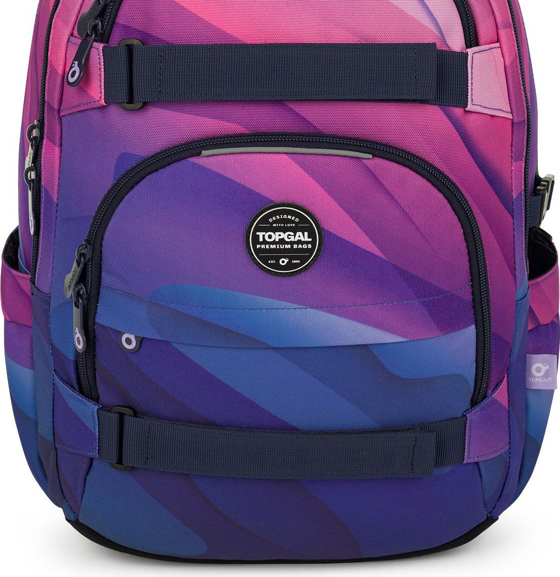 V přední části batohu jsou tři malé kapsy. Horní kapsička je polstrovaná a je jako dělaná na telefon nebo powerbanku. Spodní větší kapsa obsahuje organizér na drobnosti a skvěle pojme svačinový box nebo ETUI 25032 ve stejném designu jako batoh. Postranní kapsy na gumu jsou vyrobeny ze stejného materiálu jako batoh a skvěle udrží 1,5 litrovou lahev. Reflexní prvky jsou decentní, přesto zaručí skvělou viditelnost.