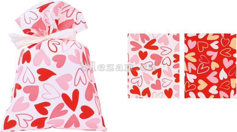 Dárkový sáček v bílé a červené barev s motivem srdíček.