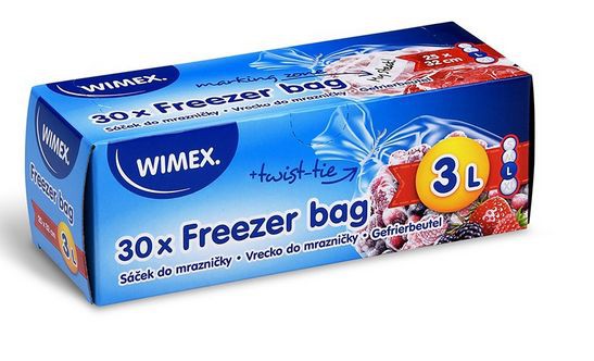 Sáčky do mrazničky s uzávěrem, objem 3 l, rozměry 25 x 32 cm; dodávané v papírovém boxu po 30 ks.