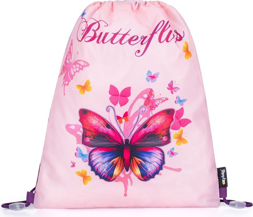 Sáček na přezůvky s motivem motýla. Uzavírání stažením šňůrek, možnost nosit i na zádech nebo připevnit ke školnímu batohu. Materiál 100% polyester.