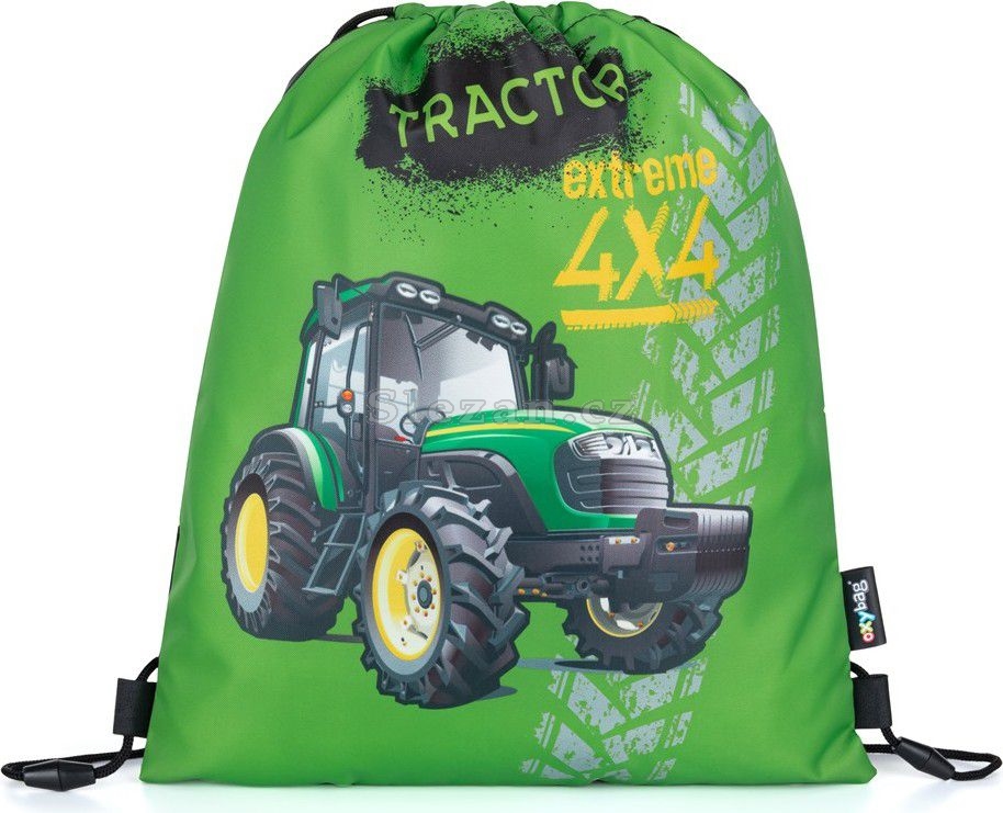 Sáček na přezůvky s motivem traktoru. Uzavírání stažením šňůrek, možnost nosit i na zádech nebo připevnit ke školnímu batohu. Materiál 100% polyester.