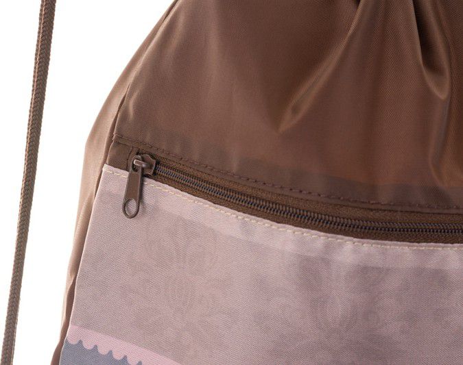 Stahovací šňůrka spojená se spodní částí promění sáček v malý batůžek na záda.