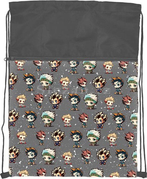 Školní sáček na přezůvky se šňůrkou na stažení ve tmavě šedé barvě s motivem anime maskotů.