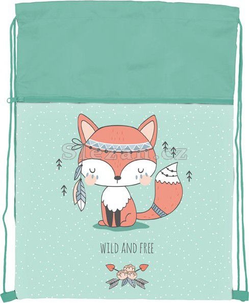 Školní sáček na přezůvky se šňůrkou na stažení ve světle zelené barvě s motivem lišky.