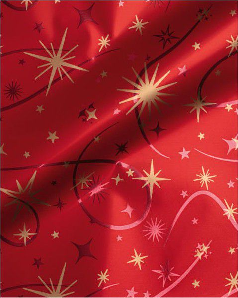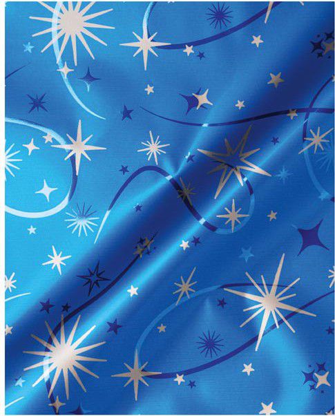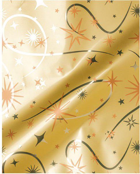 Vánoční dárkový sáček, vyrobený z lesklého materiálu, zdobený zlatými hvězdami a ozdobnými křivkami.