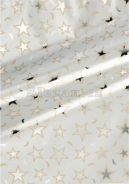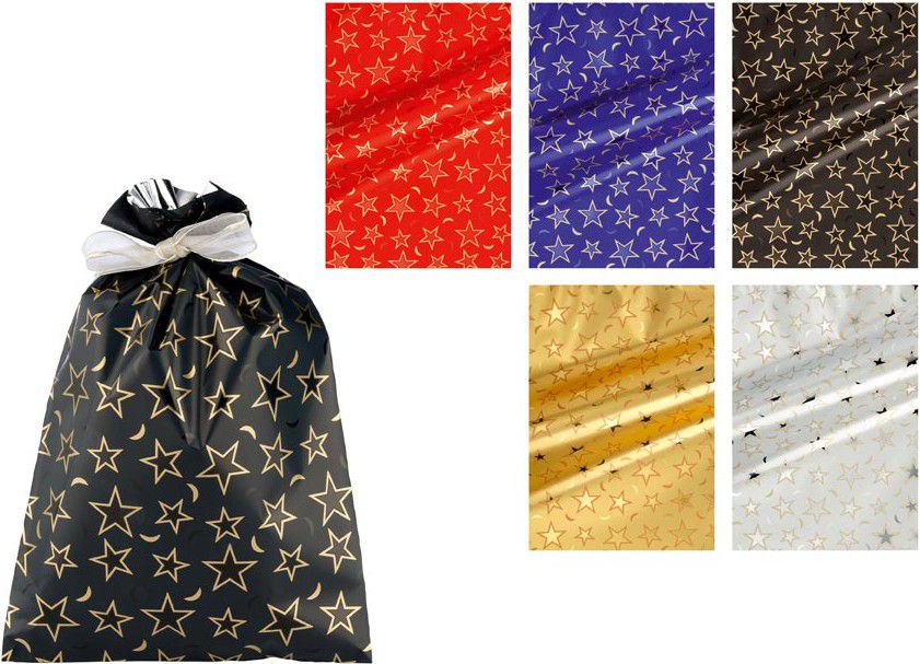 Vánoční dárkový sáček, vyrobený z lesklého materiálu, zdobený elegantním zlatým motivem hvězd. Umožňuje snadno zabalit různé druhy drobných dárků bez nutnosti použití balicího papíru. Praktický a elegantní způsob balení, který šetří čas i námahu. Sáček můžete uzavřít vázací stuhou a tím ho dozdobit.