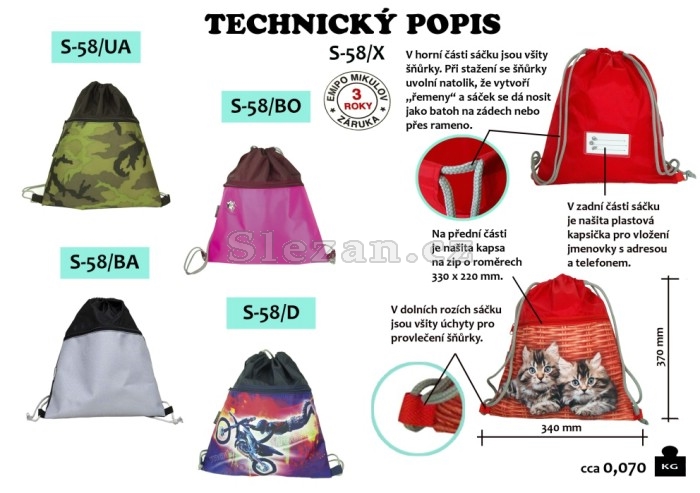 Velký školní sáček na cvičky má na celé přední části kapsu na zip. Kapsa má velikost š.330 x v.220mm, celý sáček potom š.340 x v.370mm. Na kapse je barevný celoplošný obrázek. V horní části okraje sáčku jsou navlečeny proti sobě dvě šňůrky jejichž konce jsou zašity v dolních rozích sáčku. Při stažení horní části se šňůky na bocích uvolní natolik, že vytvoří „řemeny“ a sáček se dá nosit jako batoh na zádech. Váží cca 0,07kg. Sáček je vhodný pro žáky 1.stupně ZŠ.