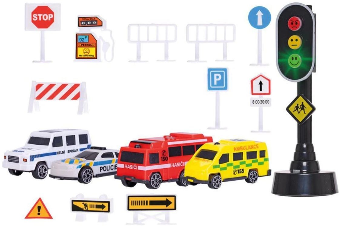 Sada obsahuje také funkční semafor a dopravní značky, které dětem pomohou zábavnou formou poznávat pravidla silničního provozu.