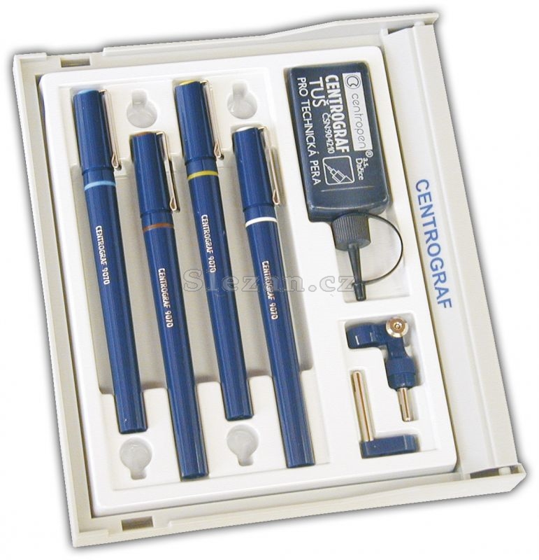 Tech. pera 0.25, 0.35, 0.5, 0.7 mm. Tuš, nástavce do kružítka. Odpovídá normám ISO, DIN a ČSN.