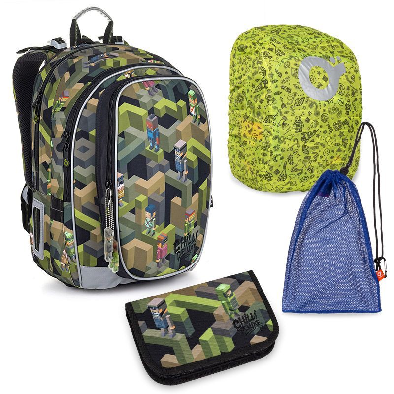 Zvýhodněný set se skládá z těchto produktů: Školní batoh MIRA 20046 B Školní pouzdro PENN 20046 B Pytlík na přezůvky TOP 150 Q - Dark Blue Pláštěnka na batoh ZIGI 17001 B