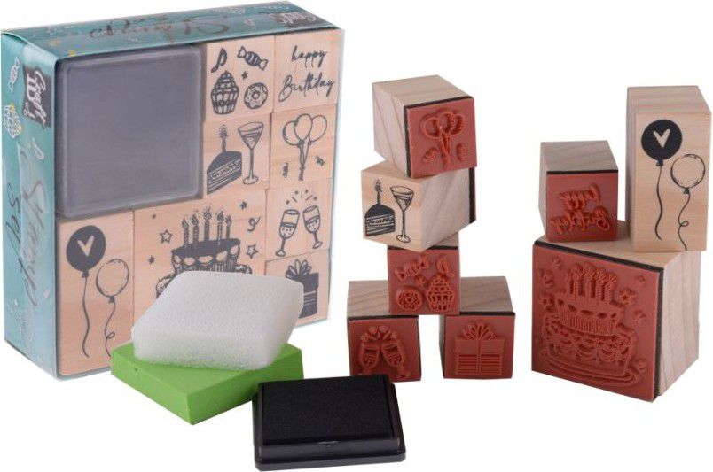 Sada dřevěných razítek s poduškami Happy Birthday. Balení obsahuje 8ks razítek a 1ks razítkovací podušky (černá). Rozměry razítek: cca 2x2cm, 2x4cm, 4x4cm, v. cca 3cm