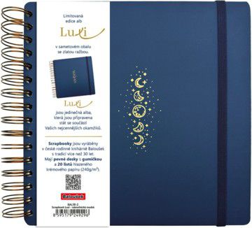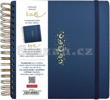 Limitovaná edice scrapbooků se sametovým přebalem v moderní tmavě modré barvě a se zlatým motivem Vesmíru. Luxi jsou jedinečná alba s krémovým papírem, kroužkovou vazbou a s gumičkou pro všechna Vaše tvoření. Do alba lze vlepovat fotografie nebo si do něj zapisovat všechny Vaše myšlenky. Naše alba jsou nejen krásná na pohled, ale také trvanlivá a připravená stát se součástí Vašich nejcennějších okamžiků. Vytvořte si svou vlastní unikátní sbírku vzpomínek s našimi luxusními scrapbooky.