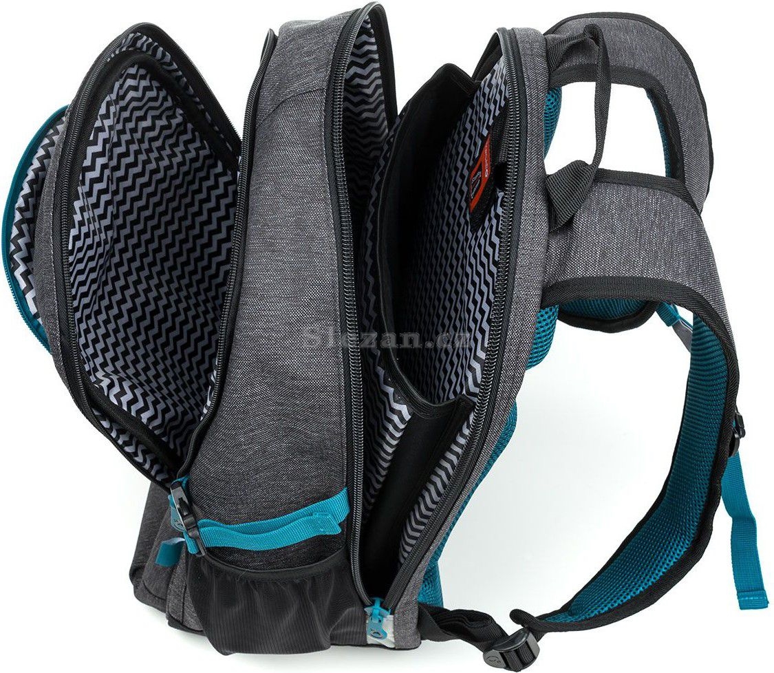 Přední užší kapsa je uvnitř vybavena síťovou kapsou na zip. Na přední straně batohu najdete ještě dvě kapsy. Přední hluboká kapsa je ideální na všechny drobnosti nebo ji můžete využít třeba na svačinu. Opticky je na tomto modelu zvýrazněna azurovým zipem. Menší přední kapsa je vhodná na všechny nezbytnosti, které potřebujete mít rychle po ruce. Na obou bocích batohu jsou síťové kapsy. Do jedné z nich uložíte i velkou PET lahev, která se dá zajistit kompresním popruhem s přezkou.