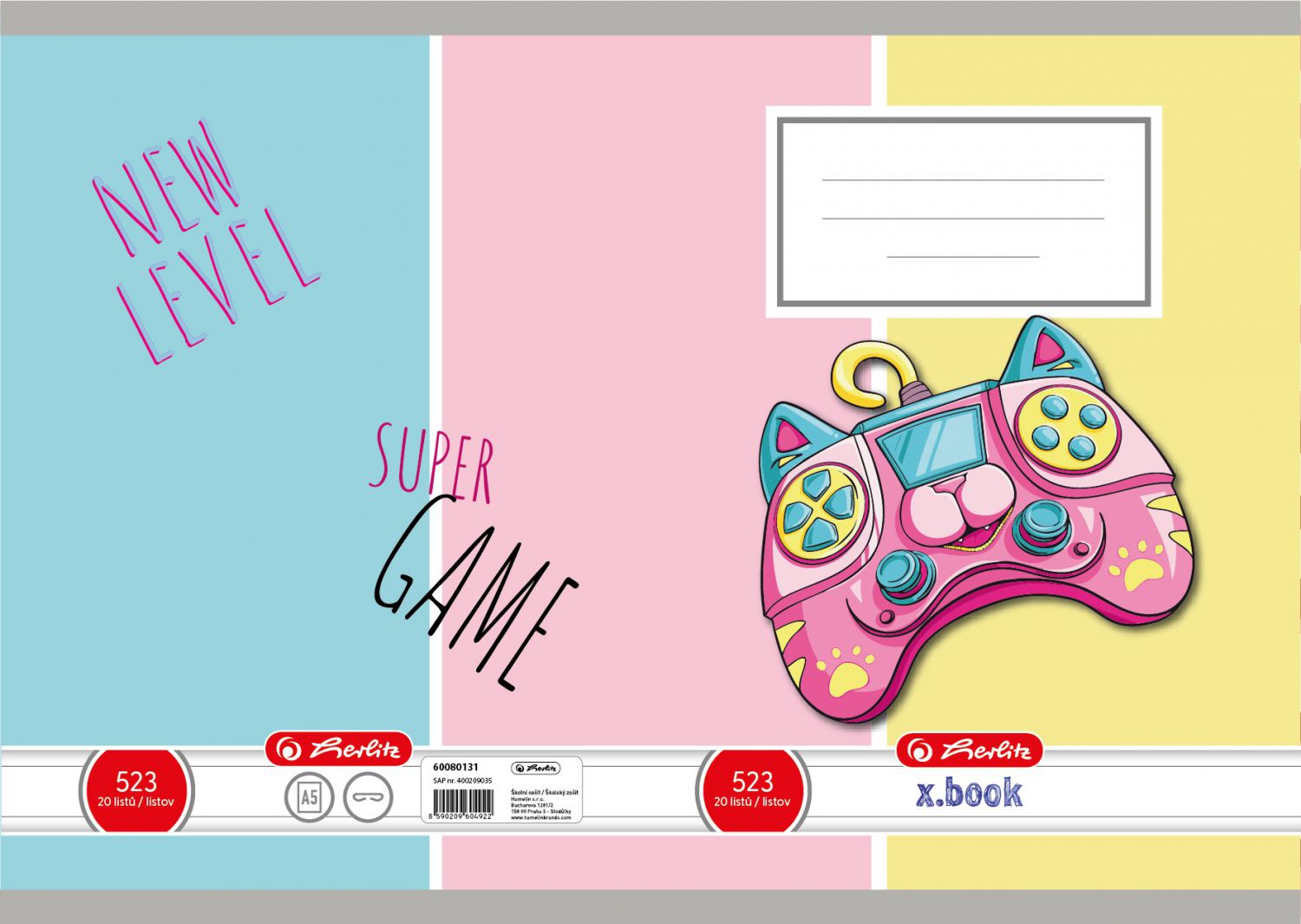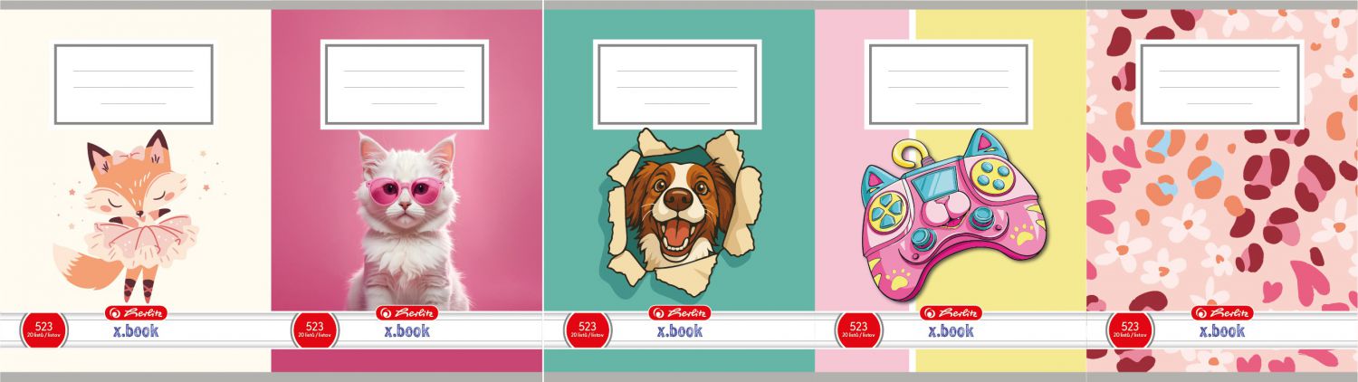 Motivy lišky, kočky, psa, gamepadu a květin dodávají sešitu hravý a veselý vzhled.