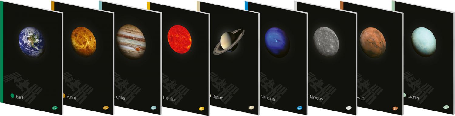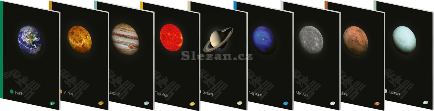 Stylizované fotografie na obálkách kvalitních sešitů tvoří kolekci Sluneční soustavy. Design obálky doplňuje efekt lesklých detailů spolu se textovými informacemi o vesmírném tělese na zadní straně. Série obsahuje 9 obálek.