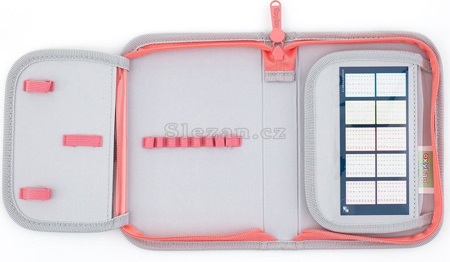 Penál: Jednopatrový školní penál s 2 chlopněmi, prázdný obsahuje 25 gumových poutek pro uchycení psacích potřeb. Na vnitřních chlopních jsou průhledné fólie pro rozvrh hodin.
