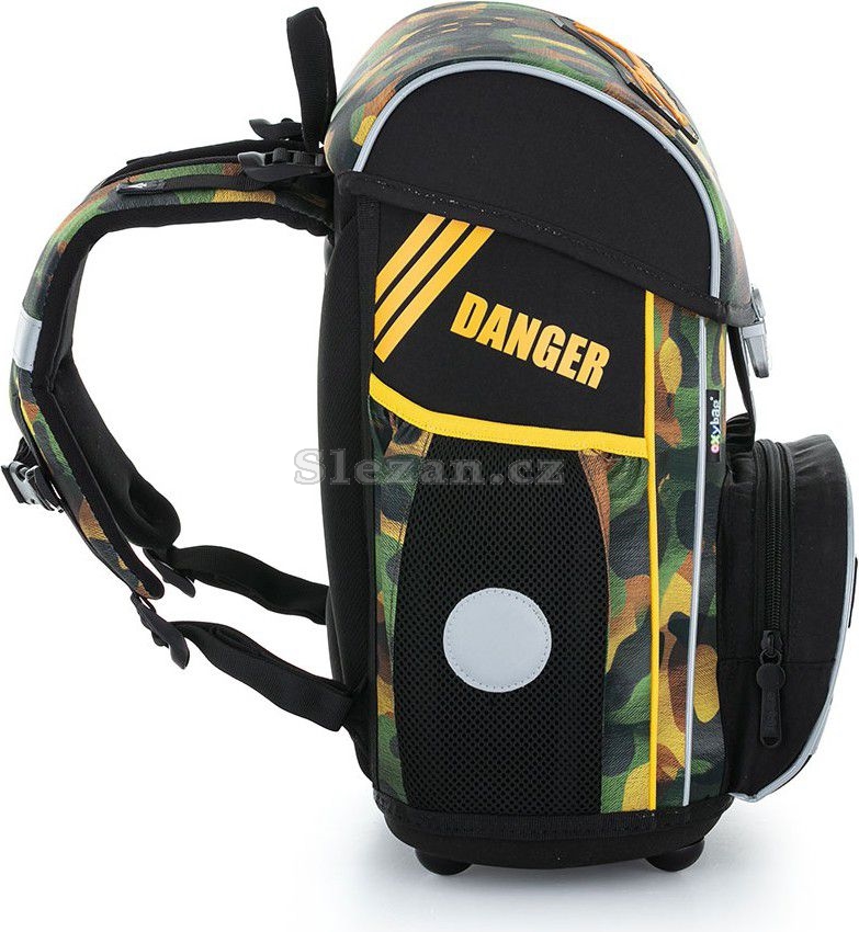 Aktovka: Školní aktovka z řady Premium s motivem army helikoptéry je anatomicky tvarovaná a zajišťuje tak správné usazení na zádech. Vyztužená záda a vnitřní výztuha udržují stálý tvar batohu. Polstrování je z příjemného prodyšného materiálu, široké měkčené popruhy jsou navrženy tak, aby dokonale přilnuly a rovnoměrně zatížily ramena dítěte. Aktovka se skládá z jedné prostorné komory, kam se pohodlně vejdou všechny školní pomůcky pro děti v 1. a ve 2. třídě. Dno batohu je z pevného materiálu, chrání tím obsah před převržením a vysypáním. Zapínání je na bezpečnostní přezku. Přední kapsička je určena na svačinu, nechybí řada reflexních prvků, díky kterým je aktovka viditelnější. Sáček: Školní sáček na cvičky vyrobený z kvalitního materiálu. Sáček se uzavírá stažením šňůrek. Vhodný jak do školy, tak na sport a další volnočasové aktivity dětí. Penál: Jednopatrový školní penál se dvěma chlopněmi bez náplně. Gumová poutka k uchycení psacích potřeb. Na vnitřní chlopni je průhledná fólie pro rozvrh hodin.