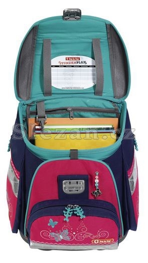VNITŘNÍ USPOŘÁDÁNÍ - prostorná hlavní kapsa s vnitřní kapsou je určena pro těžší předměty (např. učebnice), zajistí rovnoměrné rozložení hmotnosti - uvnitř aktovky karabina na klíče - ve víku aktovky gumičky pro připevnění penálu, lepší přehled v aktovce