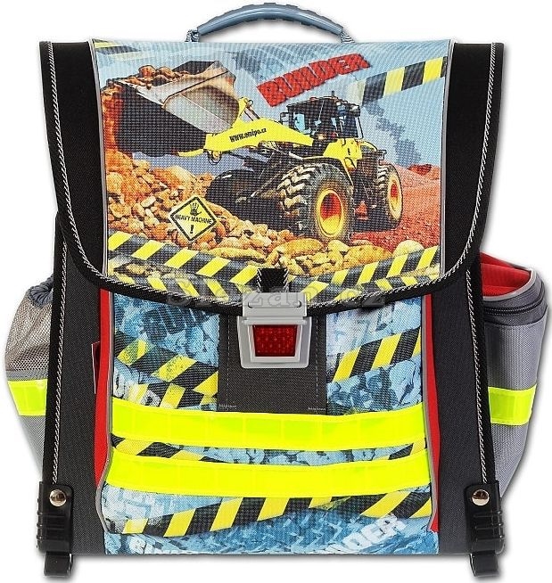 Přes celou šířku přední kapsy jsou našity dva bezpečnostní reflexní pásky a přes obě boční kapsy jeden. Školní aktovka je uzavřena prostorově tvarovanou klopnou přes celý svůj obvod, včetně přední kapsy.