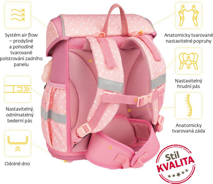 - POHODLÍ – výškově nastavitelný hrudní a nově i odnímatelný bederní pás s kvalitní přezkou zajistí pohodlné usazení aktovky na zádech dítěte i správné rozložení váhy