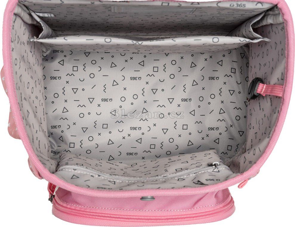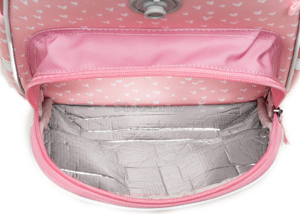- VNITŘNÍ USPOŘÁDÁNÍ – prostorná hlavní vnitřní komora je rozdělená látkovou přepážkou pro uložení boxu na sešity či knih. Součástí hlavní komory je také kapsička pro uložení drobností, odepínatelný kroužek na klíč a štítek na jméno a adresu. Ve víku je průhledná kapsička na rozvrh hodin